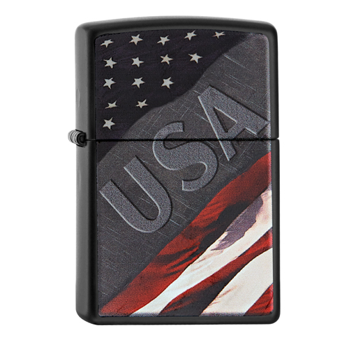 Mat zwarte Zippo aansteker met aan de voorzijde een opdruk van elementen uit de Amerikaanse vlag en de tekst: "USA".