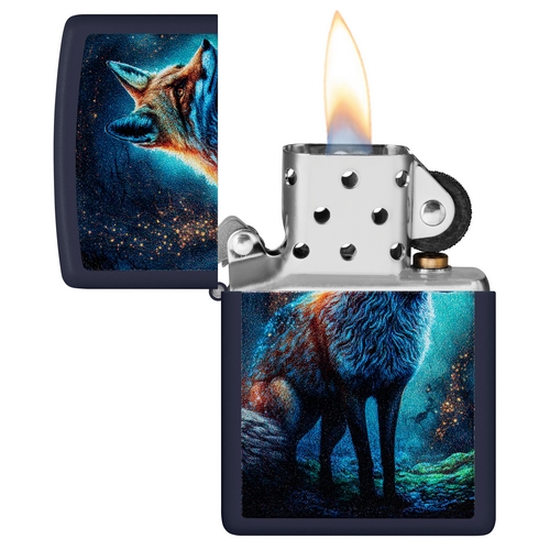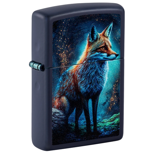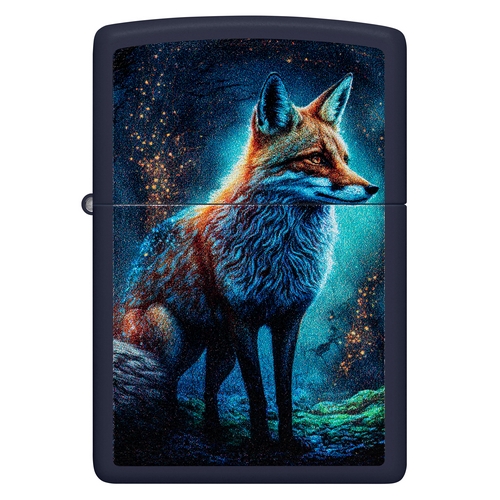 Deze Zippo aansteker heeft een matt navy afwerking met aan de voorzijde een kleurprint van een kleurrijke vos.
