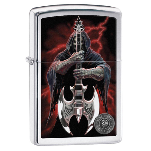Zippo aansteker met een hoogglans chromen afwerking en aan de voorzijde een opdruk van een skelet die een bijlvormige gitaar vast houd.