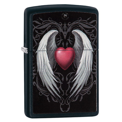 Deze mat zwarte Zippo benzine aansteker is afkomstig uit de Zippo Anne Stokes collectie en is voorzien van een luxe, slijtvaste kleurenprint van twee engelen vleugels met in het midden een rood hart.