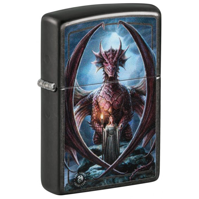 Deze Zippo heeft een zwarte afwerking en is aan de voorzijde bedrukt met een afbeelding van een draak samen met Anne Stokes. Het heeft dus een donkere gloed.
