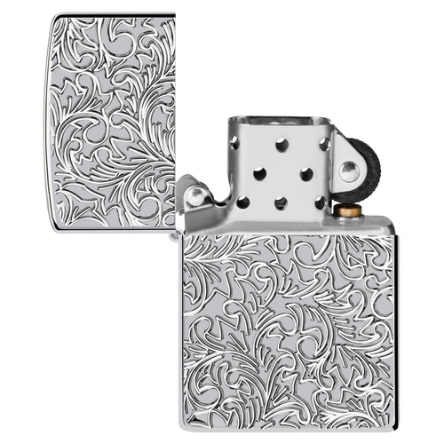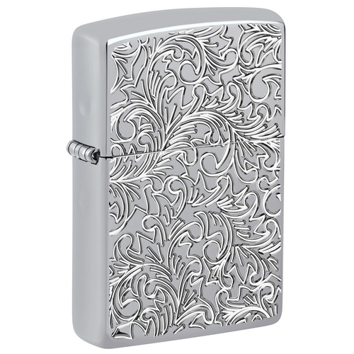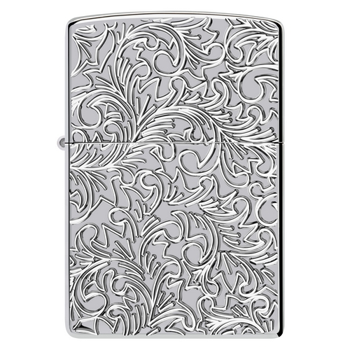 De Zippo armor case Pattern Design is hoogglans chrome afgewerkt met op de voorzijde een gravure van een sierlijk patroon.
