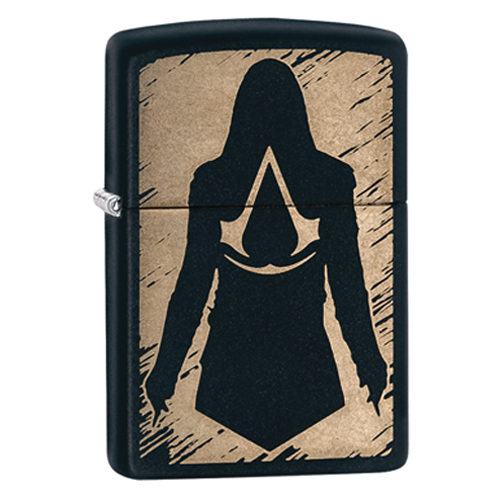 De mat zwarte Zippo is aan de voorzijde voorzien van een slijtvaste print van een silhouette uit de videogame Assassin's Creed.