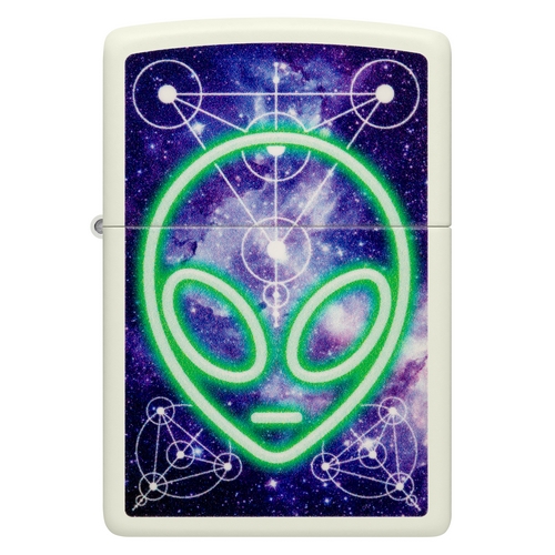 De Zippo Glow in the Dark alien heeft aan de voorzijde van de aansteker een kleurprint van een Alien. Ook heeft deze aansteker een speciaal effect: Glow in the Dark. Hij kan namelijk veranderen van kleur in het donker en zo heeft het dus in het licht andere kleuren dan in het donker wat een speciaal effect geeft!