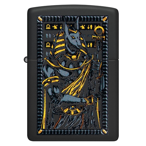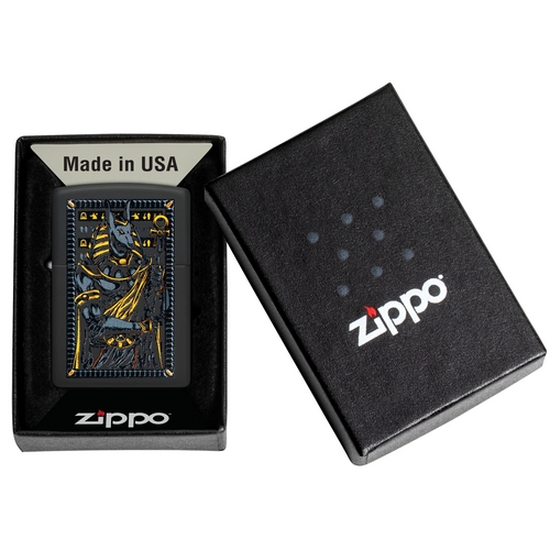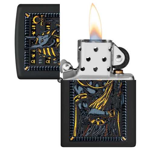 De Zippo Mythological Design is mat zwart afgewerkt met een kleurprint van een mythologisch figuur op de voorzijde.