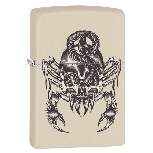 De Zippo scorpion skull is een crèmekleurige benzine aansteker met een matte afwerking afkomstig uit de Zippo Fantasy collectie. Deze Zippo aansteker is voorzien van een slijtvaste afbeelding met daarop een schedel en kenmerken van een schorpioen.