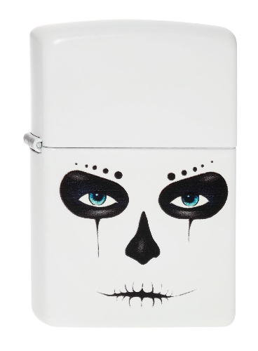 Witte Zippo aansteker met een afbeelding van een doodshoofd masker.