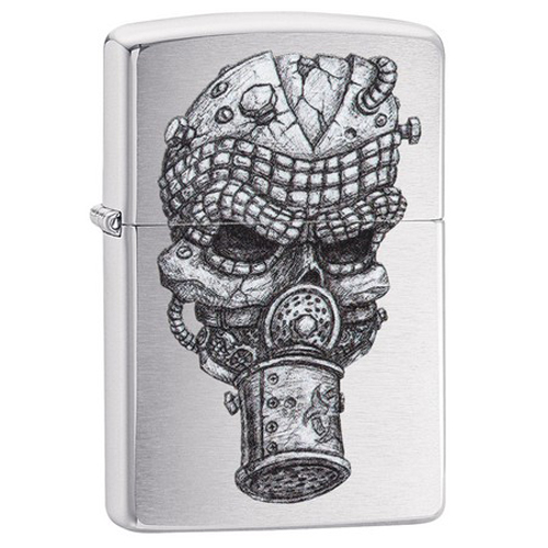 De geborsteld chromen Zippo aansteker is aan de voorzijde voorzien van een slijtvaste print van een schedel met gasmasker.