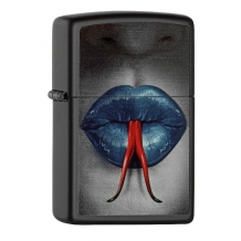 Mat zwarte Zippo aansteker met op de voorzijde een afbeelding van een vrouwelijke vampier. Links naast het gezicht is een spinnenweb verwerkt met daarin het Zippo logo.