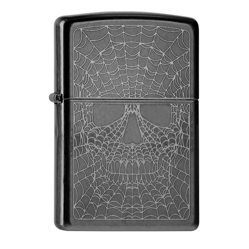 Donkere Zippo aansteker met op de voorzijde een afbeelding van een doodshoofd verwerkt in een spinnenweb.