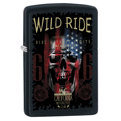 Mat zwarte Zippo aansteker met aan de voorzijde een poster van Wild Ride met een doodshoofd in de kleuren van de Amerikaanse vlag.