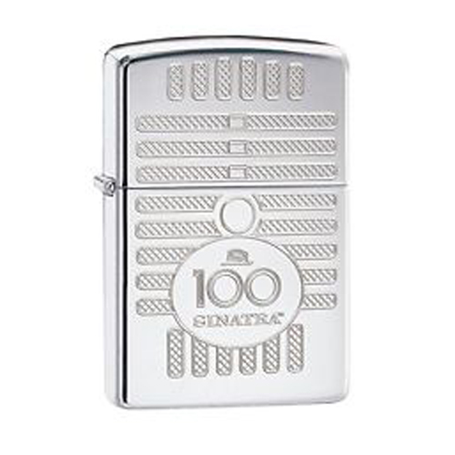 Hoogglans chromen Zippo aansteker met aan de voorzijde een gravure van een hoedje en de tekst 100 Sinatra.