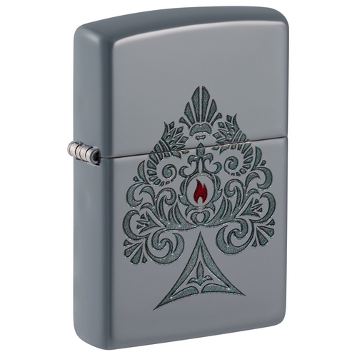 Deze Zippo aansteker met grijze afwerking is aan de voorzijde voorzien van een schoppen aas embleem met daarin het Zippo vlammetje.