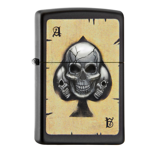 Mat zwarte Zippo aansteker met aan de voorzijde een opdruk van een schoppen Aas waar 3 schedels in zijn verwerkt.