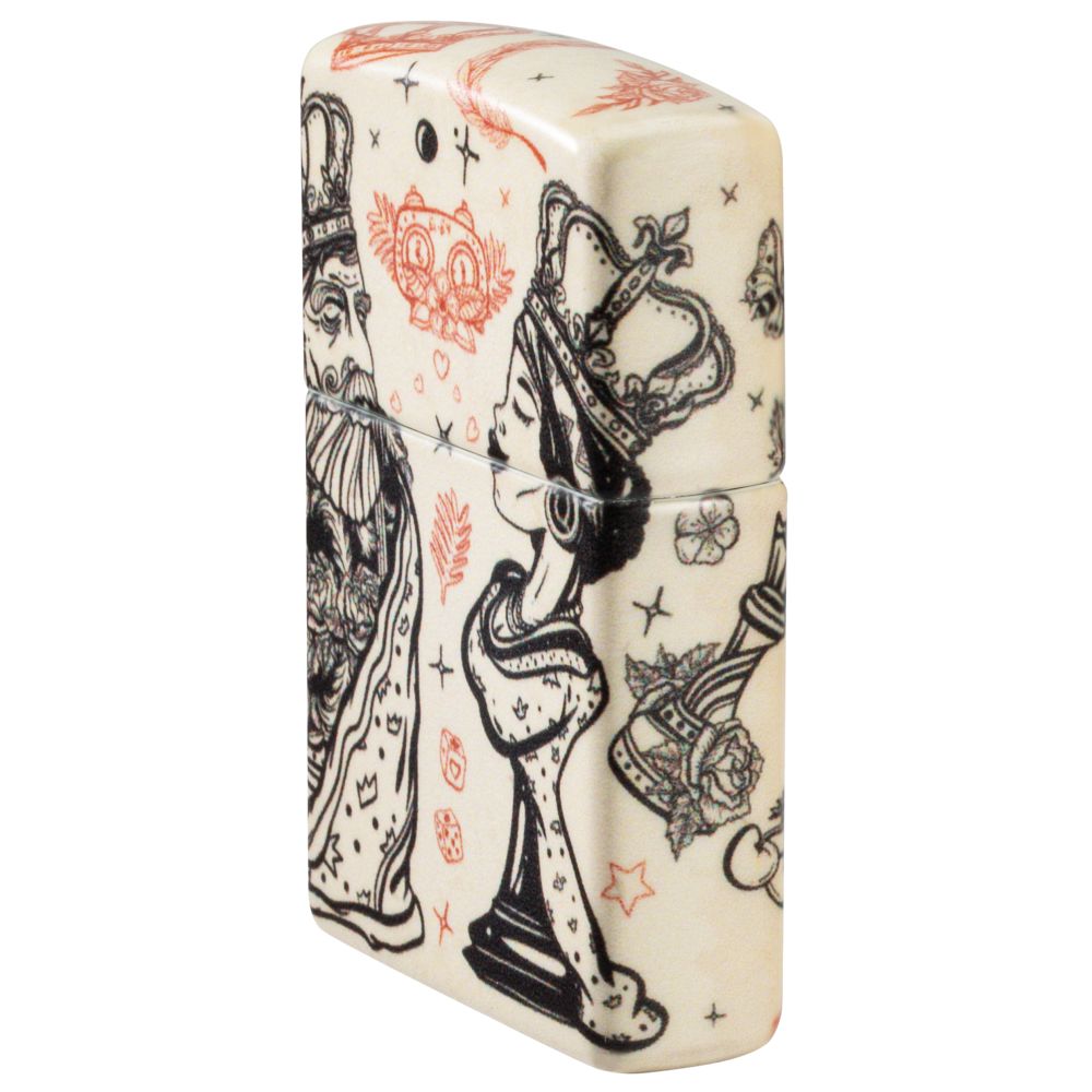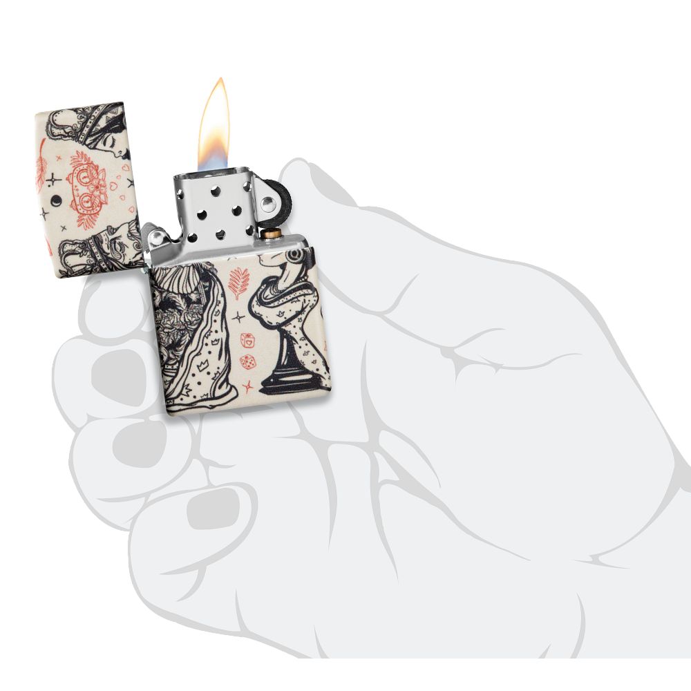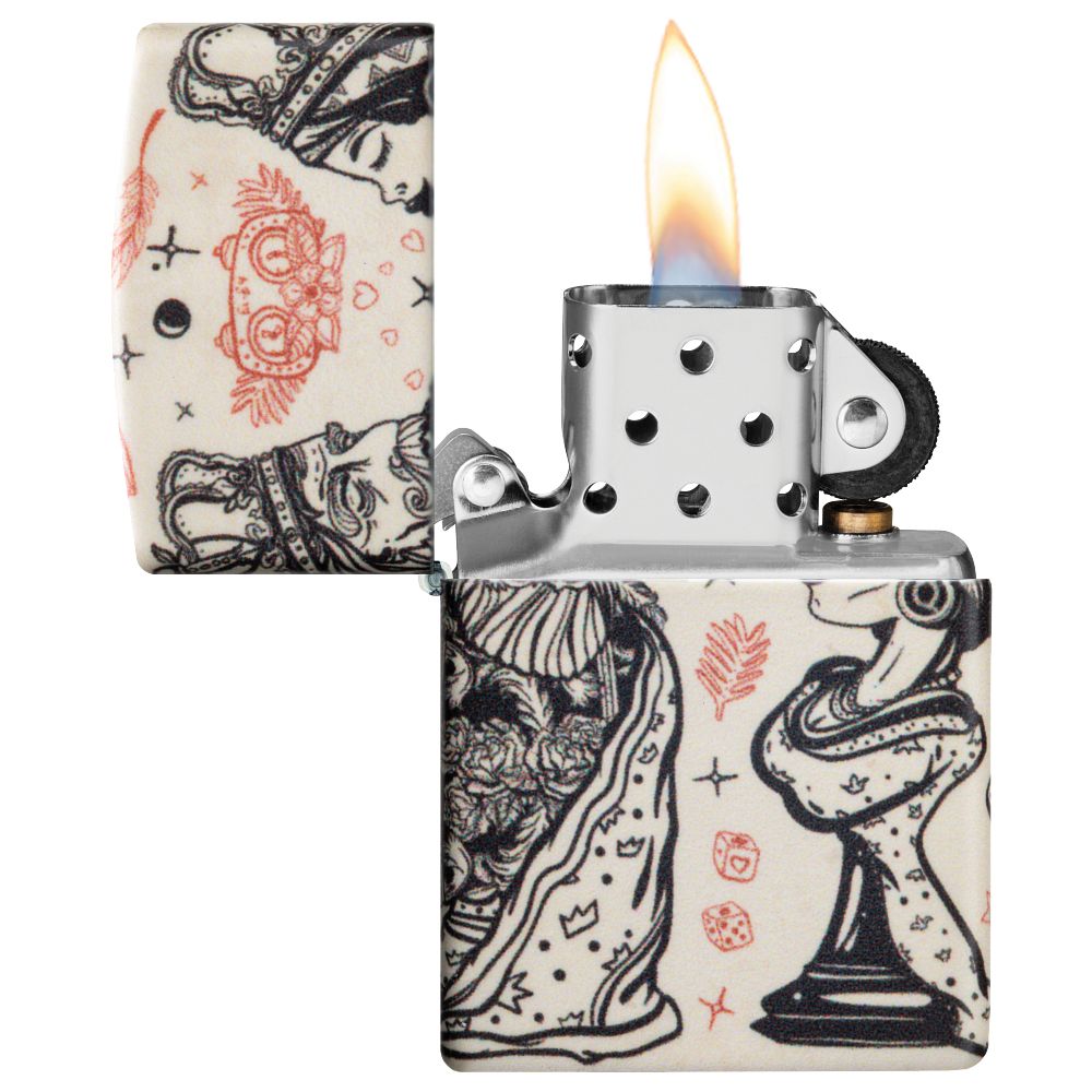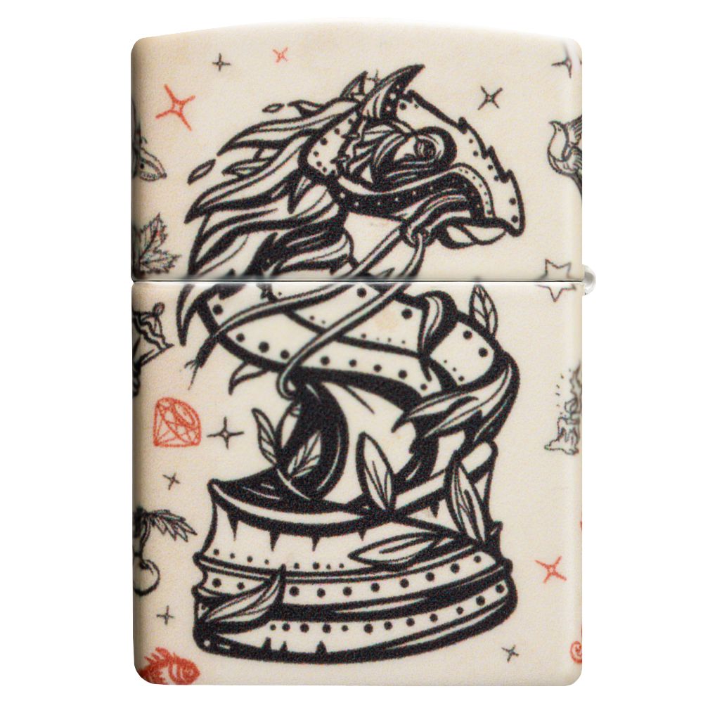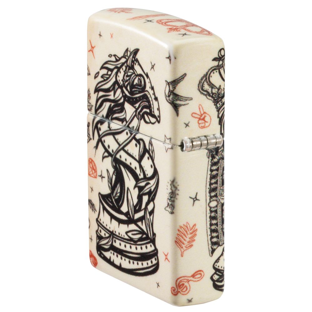 De Zippo Chess Design is matt wit afgewerkt met rondom een print waarop verschillende schaakstukken te zien zijn.