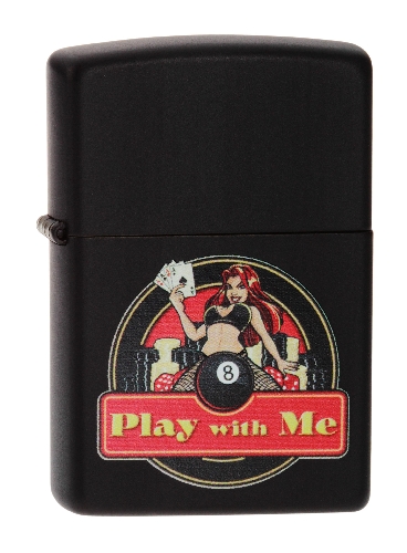 Zwarte Zippo aansteker met een kleurenprint met onder andere de tekst ''Play with me''.