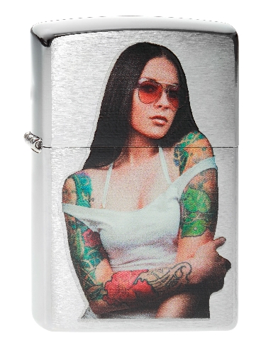 Deze chroom brush finish Zippo aansteker heeft een print van een vrouw met tatoeages op de armen.