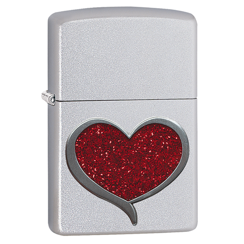 Zippo met satijn chromen afwerking met aan de voorzijde een hart uitgevoerd in rode glitters.