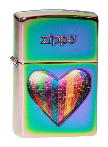 Deze spectrum Zippo aansteker heeft een oliekleur met een mozaïk hart en het Zippo logo op het dekseltje.