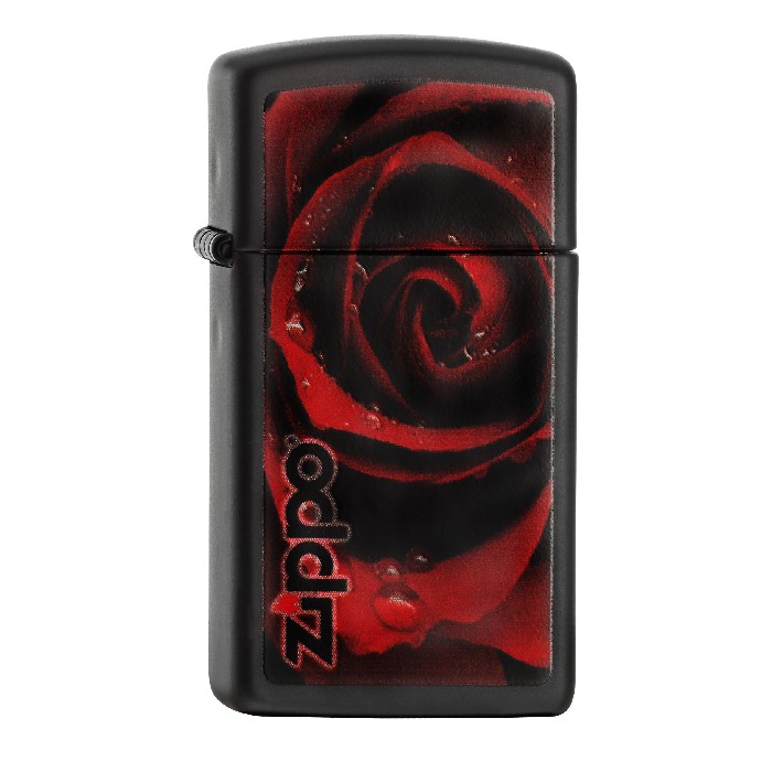Mat zwarte Zippo Slim aansteker met aan de voorzijde een opdruk van een rode roos en het Zippo logo.