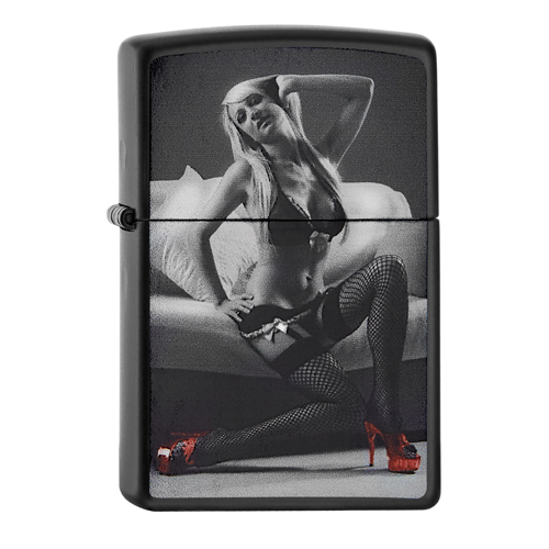 Mat zwarte Zippo aansteker met aan de voorzijde een opdruk van een sexy dame in panty op een bank.