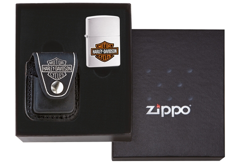 Giftset met echt lederen Zippo tasje met het Harley Davidson logo. Het tasje heeft de kleur zwart en heeft een stevige lus voor een bevestiging voor aan de riem.