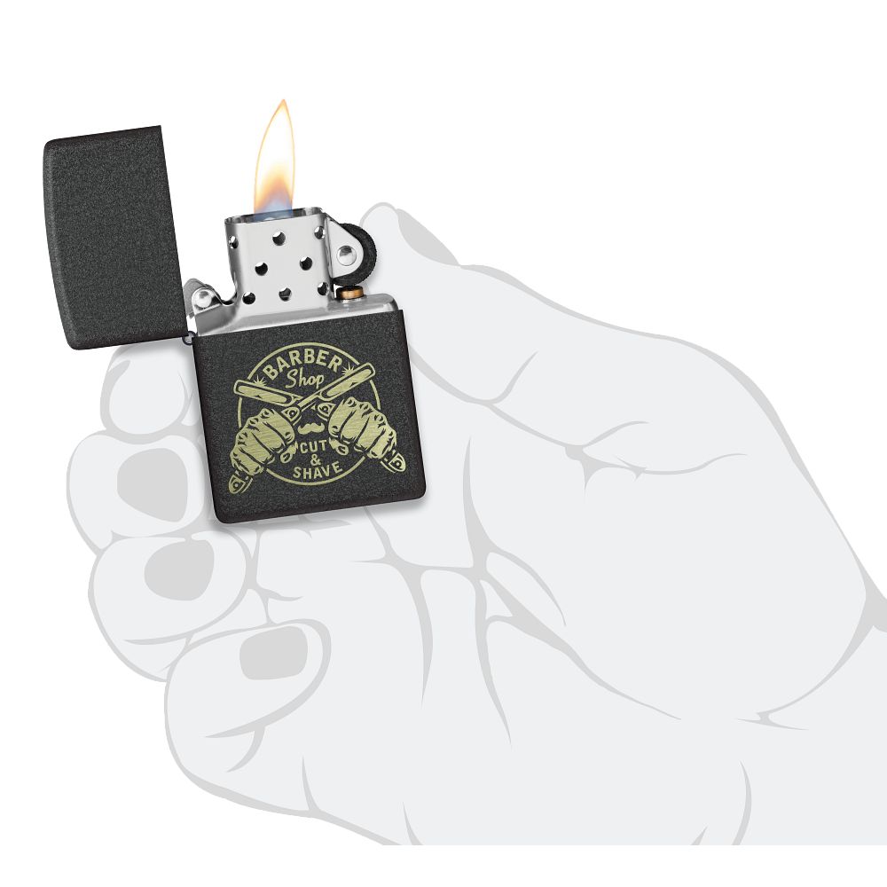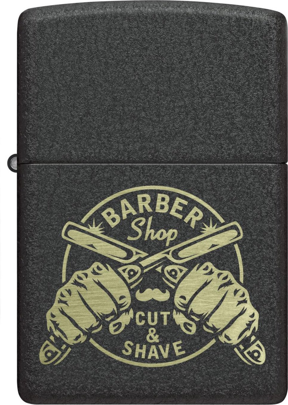 Deze Zippo heeft een Zwarte "Crackle" afwerking met aan de voorzijde een opdruk van een Kapperszaak-logo.