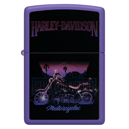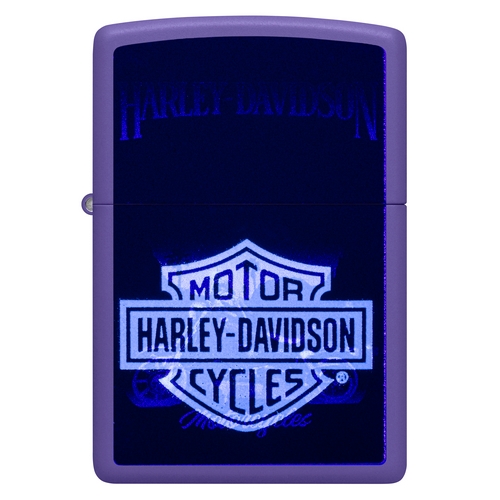 De Zippo Harley Black Light is mat paars afgewerkt met aan de voorzijde een kleurprint van een Harley Davidson motor met de tekst ‘Harley-Davidson’ erboven. Als je met een black light op deze aansteker schijnt kom het Harley Davidson logo te voorschijn.