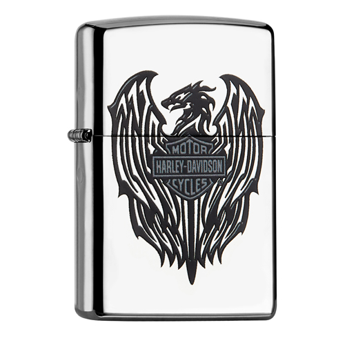 Hoogglans Chromen Zippo aansteker met aan de voorzijde een opdruk van een vogel waar het Harley Davidson logo in is verwekt.