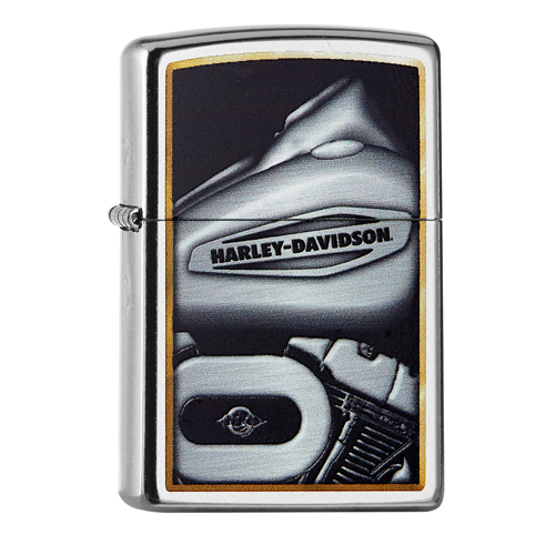 Street Chromen Zippo aansteker met aan de voorzijde een opdruk van een benzine tank waar het Harley Davidson logo in is verwerkt.