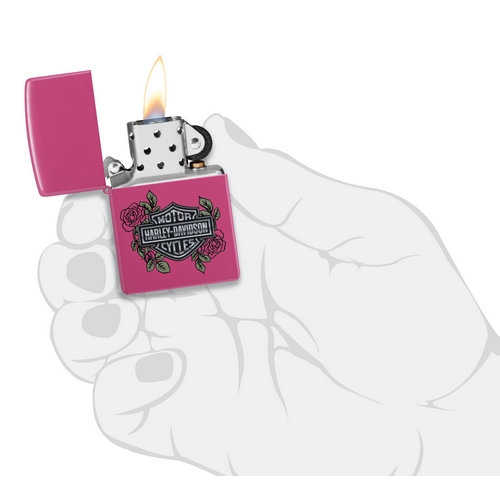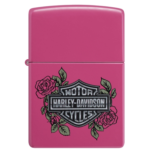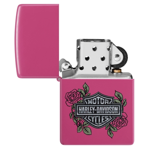 De Zippo Harley Davidson Frequency is frequency afgewerkt met een kleurprint van het Harley Davidson logo op de voorzijde met rozen hieromheen.