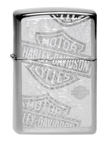 Deze Zippo aansteker bevat een sierlijke gravure met op de achtergrond het Harley Davidson logo.