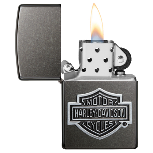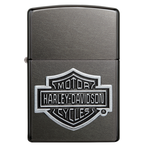 Deze Zippo aansteker heeft een donkergrijze afwerking en is aan de voorzijde voorzien van een chromen 3d embleem van het logo van Harley Davidson.