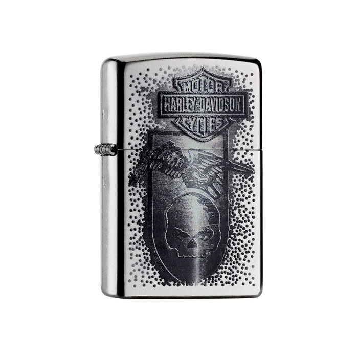 Mat chromen Zippo aansteker met aan de voorzijde een opdruk van het Harley Davidson logo, een schedel en een kraai.