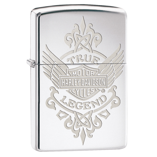 Hoogglans chromen Zippo aansteker met aan de voorzijde een gravure van tribals, het Harley-Davidson logo en de tekst True Legend.