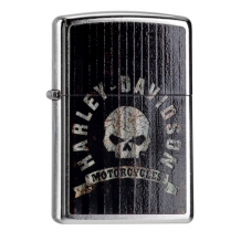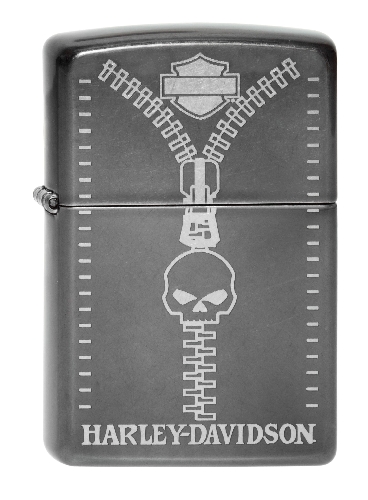 Deze donkergrijze Zippo aansteker bevat in zilver de tekst ''Harley Davidson'' en een afbeelding van een rits met een doodshoofd. De rits verwijst naar het woord zipper, daar stamt de naam Zippo vanaf.