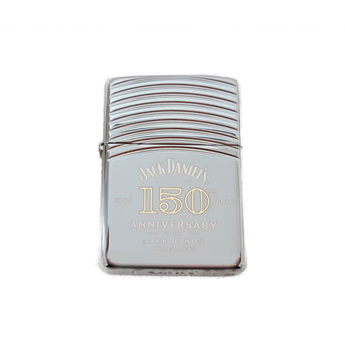 Black Ice Armor Case Zippo aansteker met gebogen groeven op het klepje en deels op de body, en op de body een gravure van de tekst: Jack Daniel's 1866 - 2016 150th Anniversary of the Jack Daniel Distillery.