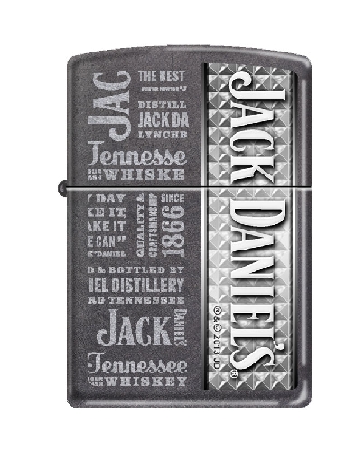 Donkergrijze Zippo aansteker met een Jack Daniel's print.