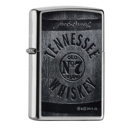 Mat chromen Zippo aansteker met aan de voorzijde een opdruk van een vat Tennessee Whiskey.