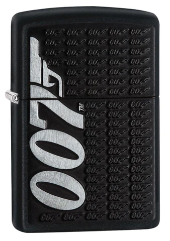 Deze Zippo aansteker heeft een mat zwarte coating rondom met aan de voorzijde een 007 3D bedrukking. De tekst gravure zal goudkleurig worden.