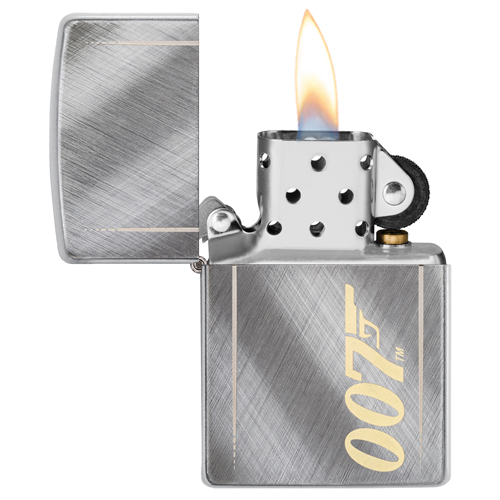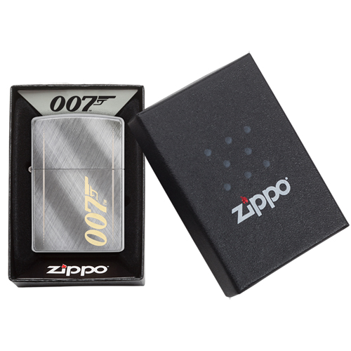 Deze Zippo benzine aansteker heeft een diagonaal geweven linnen uiterlijk en is aan de voorzijde voorzien van een slijtvaste print van de bekende James Bond 007 belettering.