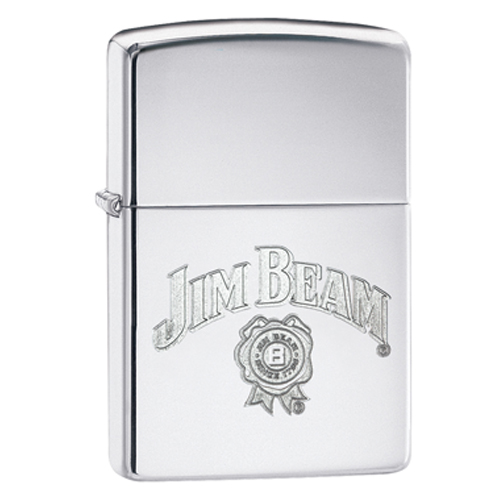 Deze aansteker in hoogglans chroom uitvoering heeft aan de voorzijde op de body een gravure van het logo van Jim Beam.