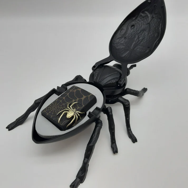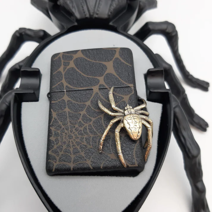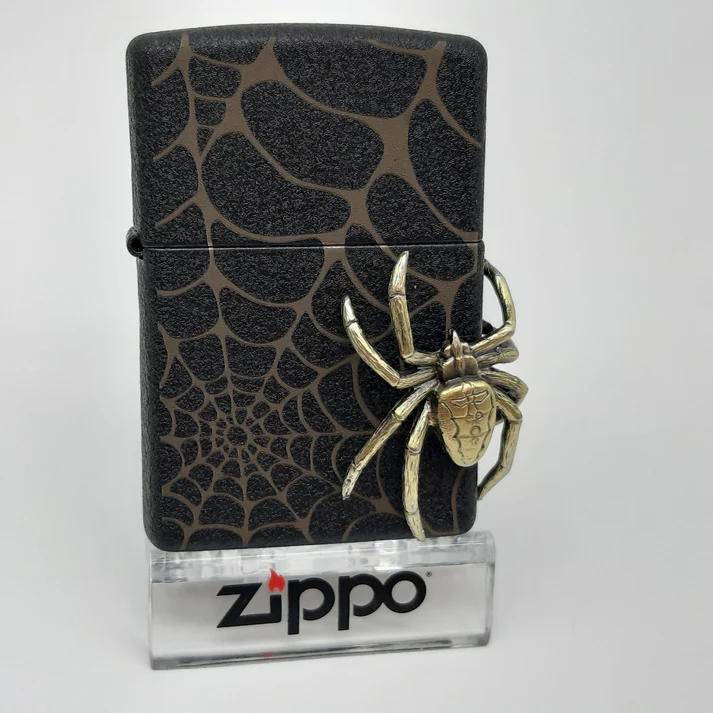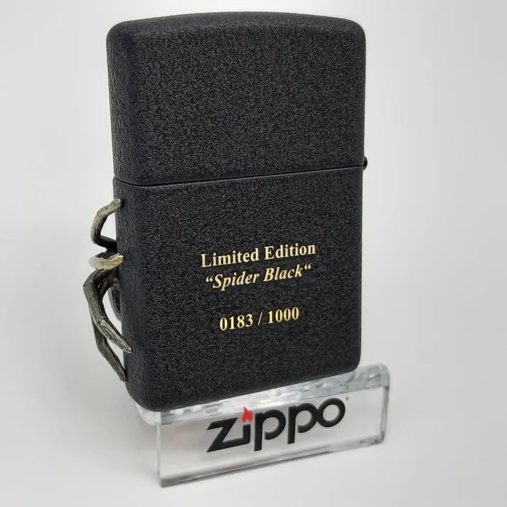 De Zippo Spider Black Crackle Emblem Limited Edition is black crackle afgewerkt met aan de voorzijde een lasergravure van een spinnenweb. Ook zit er een 3D spin op het spinnenweb van de Zippo. Dit is een gelimiteerde uitgave van 1000 stuks, waarvan de nummering op de achterzijde van de Zippo is gegraveerd. Deze aansteker zit ook verpakt in een spin, deze kan na de rand gebruikt worden als asbak.