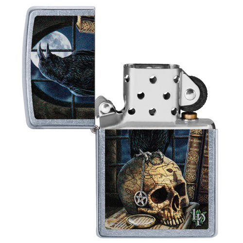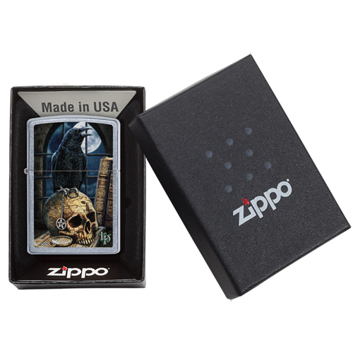 De Zippo benzine aansteker heeft een street chromen afwerking en is aan de voorzijde voorzien van een slijtvaste kleurenprint van de afbeelding van een vogel op een hoofd van een skelet bij volle maan. De afbeelding is afkomstig uit de Lisa Parker collectie.