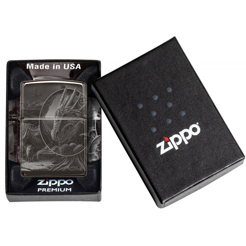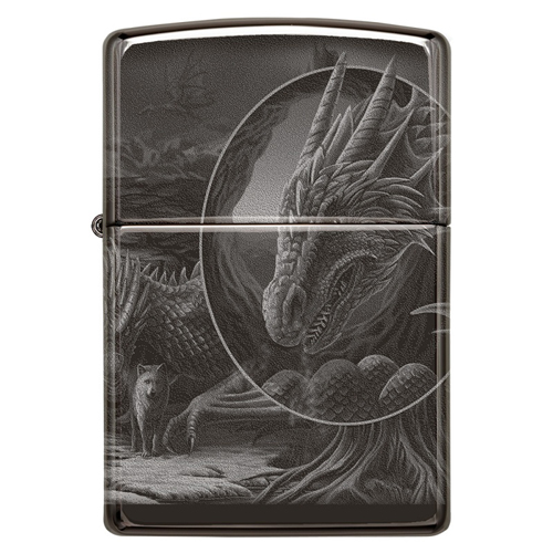 De Zippo benzine aansteker heeft een high polish zwarte afwerking en is aan de voorzijde en achterzijde voorzien van een slijtvaste kleurenprint van een aantal draken en wolf.. De afbeelding is afkomstig uit de Lisa Parker collectie.