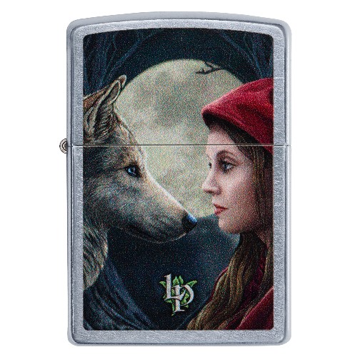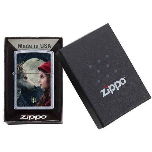 De Zippo benzine aansteker heeft een street chromen afwerking en is aan de voorzijde voorzien van een slijtvaste kleurenprint van de afbeelding van een wolf kijkend naar een vrouw met een rode kap bij volle maan. De afbeelding is afkomstig uit de Lisa Parker collectie.
