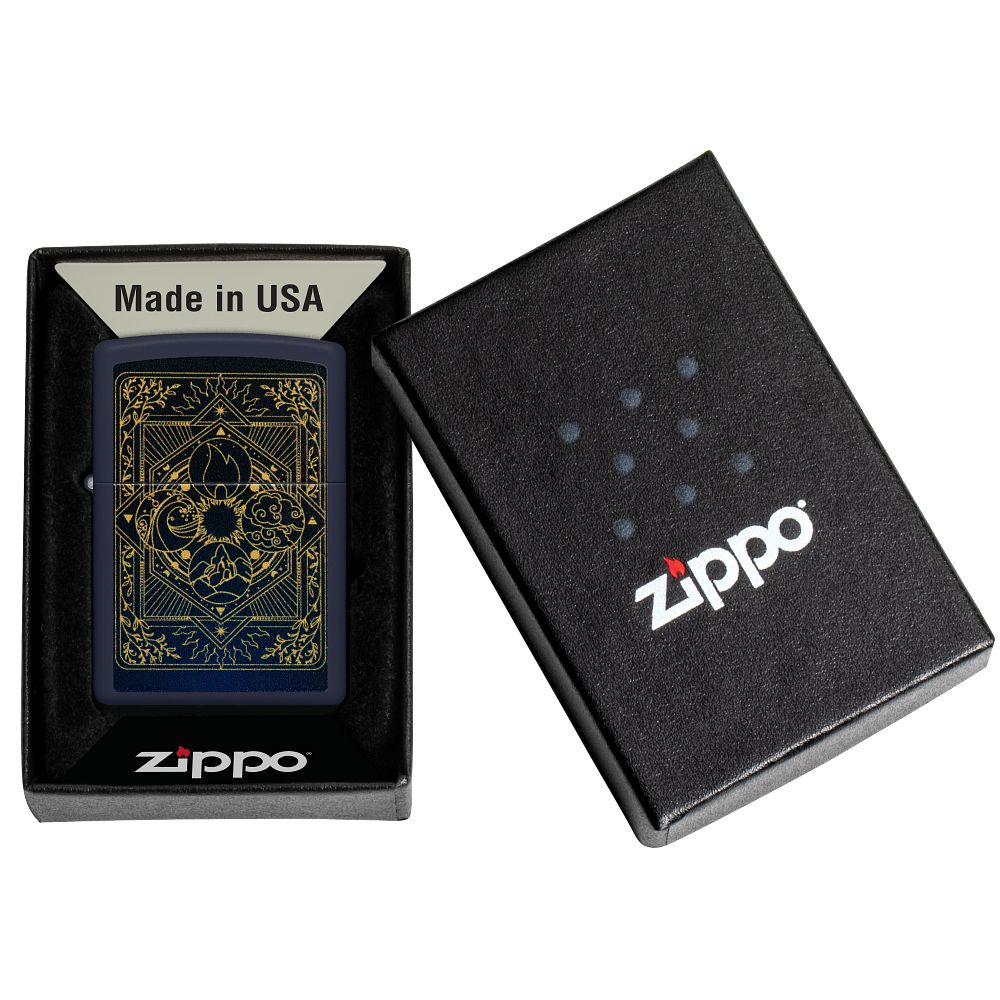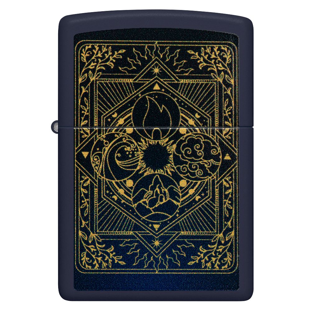 De Zippo Elements Design is matt navy afgewerkt met aan de voorzijde een kleurprint van de 4 elementen die zich hier op aarde bevinden.