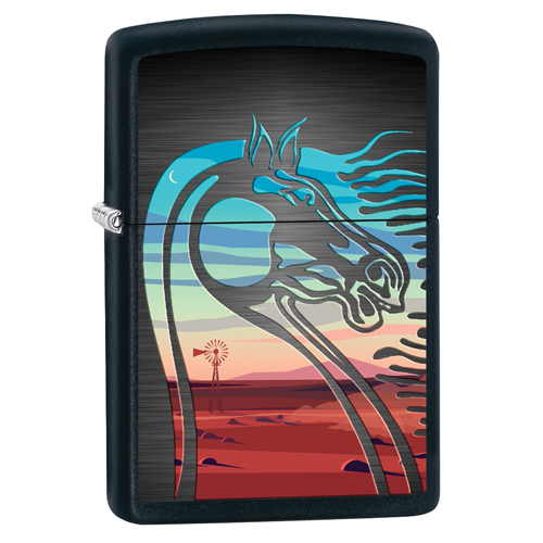 De Zippo horse is een matzwarte benzine aansteker uit de Zippo Nature collectie. Deze Zippo aansteker is voorzien van een slijtvaste afbeelding van een woestijn en de contouren van een paard.
