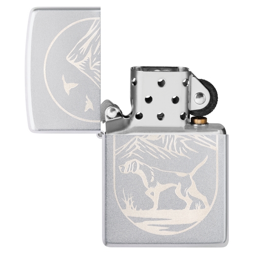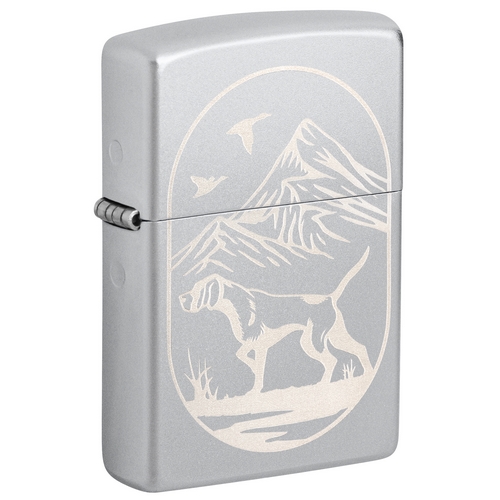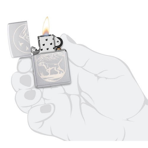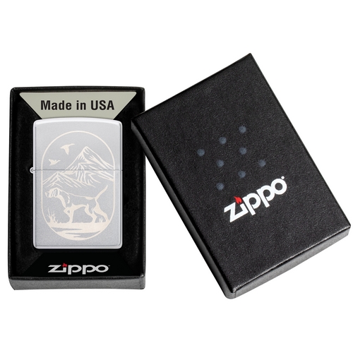 De Zippo Hunting Dog Design is satin chrome afgewerkt met aan de voorzijde een lasergravure van een jagende hond.
