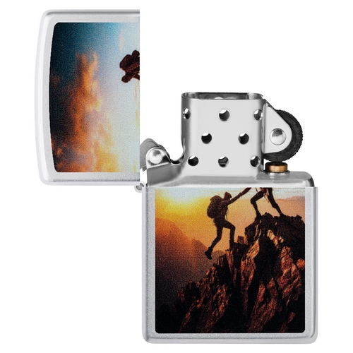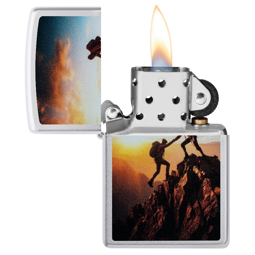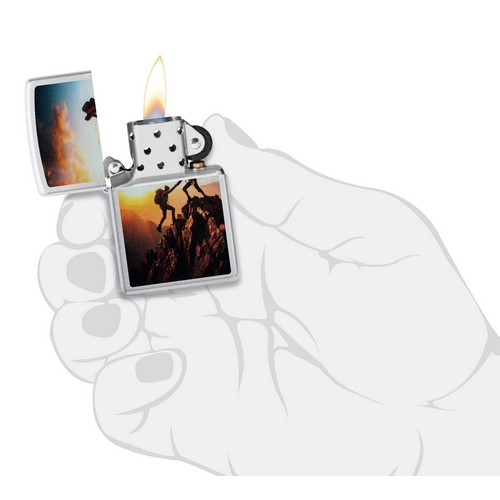 De Zippo Mountain Climbing is satin chrome afgewerkt met aan de voorzijde kleurprint van 2 bergbeklimmers.